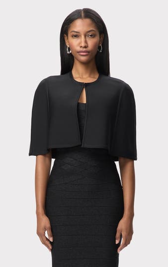The Juliette Cape is cut from an eco-friendly compact knit designed to sit on the shoulders as a sophisticated layering piece. Finished with a hook & eye closure at the neckline. Pair with the Reina Dress for a complete look.