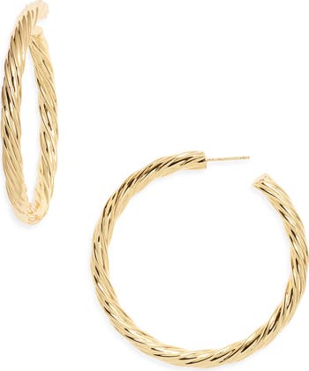 A twisted rope design highlights the 18-karat-gold plating on these gleaming hoops that make a statement.