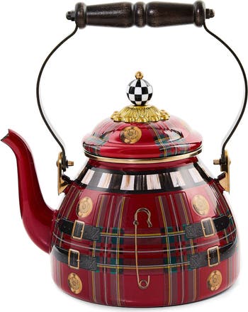 As much decor as it is utility, this heavy-gauge-steel tea kettle is hand-glazed in the brand's Kilted design and features an acacia-wood handle and a checkered finial topping the lid.