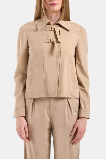 The Kitty Jacket is a masterclass in understated elegance, featuring a cropped silhouette and delicate buckle closures. Its refined tailoring and soft neutral tone make it an effortless staple for any modern wardrobe.