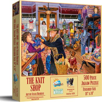 Welcome to the delightful world of "The Knit Shop," a 500 piece jigsaw puzzle from SunsOut Inc. Illustrated by renowned artist Susan Brabeau, this Americana-themed puzzle is packed with vibrant colors and charming characters, all captured in a bustling knit shop. Coming in at a satisfying 18" x 24", it invites you to lose yourself in a tapestry of intricate details. SunsOut puzzles are crafted with interlocking pieces that bring seamless assembly and durability, using premium, recycled cardboard to ensure they can withstand repeated play. Our puzzles, proudly made in the USA, showcase our commitment to sustainability by incorporating eco-friendly materials and soy-based inks, perfect for adults who appreciate quality while also prioritizing environmental responsibility. The Knit Shop, featuring fully licensed artwork, serves as a beautiful reflection of community and tradition, immortalized through stunning artistry and attention to detail. By purchasing this puzzle, you are supporting SunsOut, a proud woman-owned small business committed to delivering high quality puzzles and encouraging empowered entrepreneurship. Dive into the therapeutic journey of assembling "The Knit Shop," each piece coming together to create a scene that brings a sense of satisfaction and peace, making it a perfect gift for yourself or a loved one. Embrace the challenge, joy, and magic of puzzling with SunsOut today!