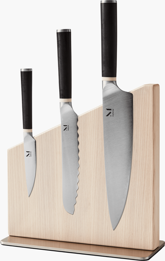 Our bestselling chef's knife set designed to be displayed. Our trio of knives are made from Japanese stainless steel and high carbon to be meticulously sharp and incredibly resilient. Their perfect match? The Stand, which we designed to store your knives in a show-stopping yet practical way, with an entirely magnetic wooden body.