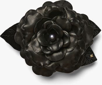 Celebrated for its beguiling scent, the gardenia denotes purity, refinement, harmony, affection and trust. Gardenias are often gifted on hopeful occasions. Lovingly handcrafted with soft black leather petals and crepe back satin, this striking bloom features ebony silk velvet leaves and is centered with a luminescent freshwater pearl. The gardenia is the national flower of French Polynesia.
