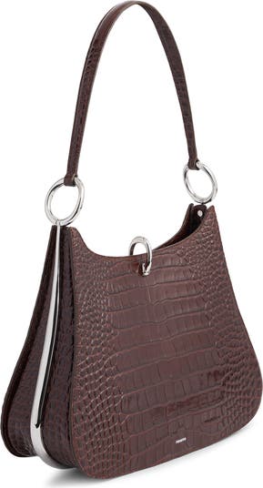 Rabanne introduces a new silhouette to their lineup of iconic bags with this croc-embosssed leather shoulder bag highlighted with a continuous curve of polished hardware wrapping the base. Ring hardware anchors the strap while also recalling the label's signature ring-pierced discs.