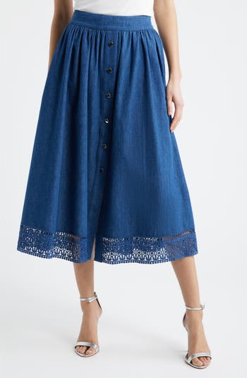 Intricate floral lace appliqué cascades from the hem of this denim skirt for a dimensional, textural effect.