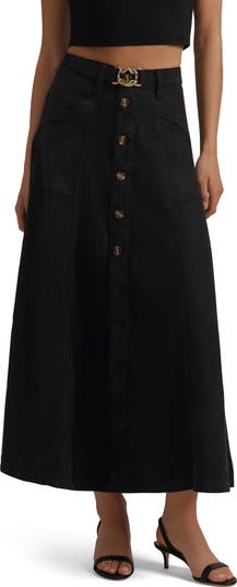 Made from lightweight, stretch-kissed denim, this classic A-line skirt features a button-front closure and is topped with a matching belt featuring a glossy goldtone buckle.