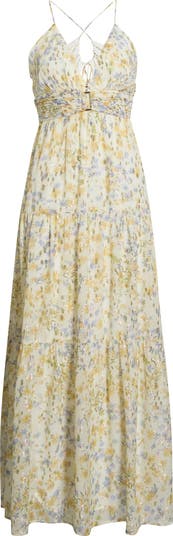 Showered in flowers and flecked with gilded details, this party-ready maxi dress is shaped with rows of ruffles and served with a sassy open back.