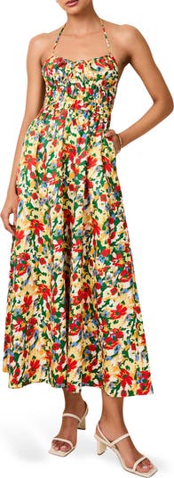 Sweet bodice smocking shapes the silhouette of this flared, flowery maxi that's meant to show off your shoulders and back.