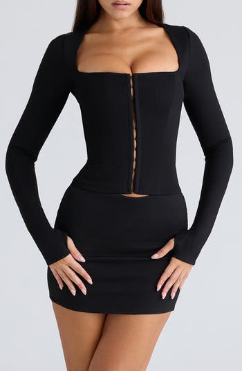 Made from heavy and thick stretch ponte, this long-sleeve top featuring structured boning and a hook-and-eye closure down the front is a sassy addition to your going-out wardrobe.