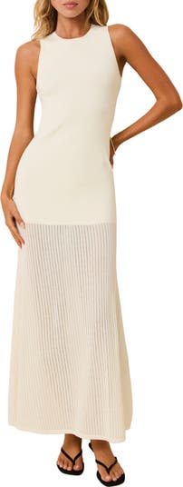 A soft sweater-maxi is made in a sleeveless figure-skimming silhouette and finished with airy open stitching for a semisheer effect.