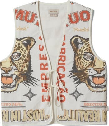 Wild-eyed graphics make a striking statment for a weekend-official vest cut from a cotton-forward blend.