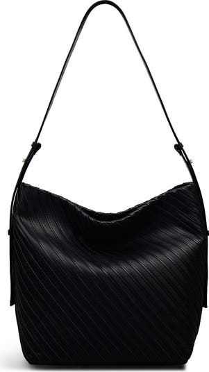 Modern design meets intricate artisan craftwork cross The Luxborough, a soft oversized bucket bag with individually sewn appliqué leather stripes. This throw-all-in shoulder bag is finished with a padded, adjustable strap and rolled top edges that conceal the set-down zip.