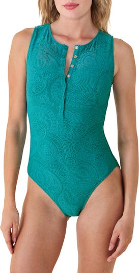 A half-snap placket lends sporty flair to this one-piece swimsuit elevated by textural paisley jacquard.