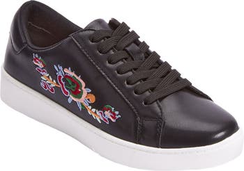 - Leather-like upper with embroidered flower detail