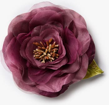 Evoking nostalgia and mystery, the Mauve Open Rose is known for expressing gratitude, admiration and romance. This delicate bloom is lovingly handmade with hand-dipped bronze and gold stamens, layers of hand-dyed mauve silk habotai, silk organza and silk crinkle chiffon, and features two chartreuse green silk velvet leaves.