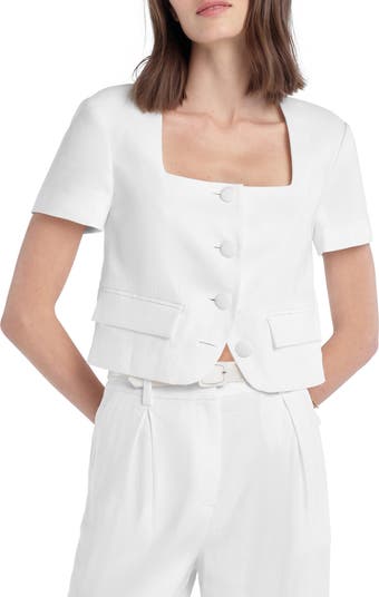 Complete your look with the structured style of this crisp linen-blend top in a cropped length that adds a touch of contemporary charm.
