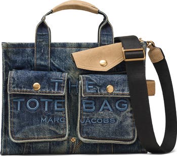 Cargo-style bellows pockets and classic patch pockets create the illusion of an upcycled pair of jeans with this midsized denim tote featuring an artfully faded, indigo-dyed rinse.