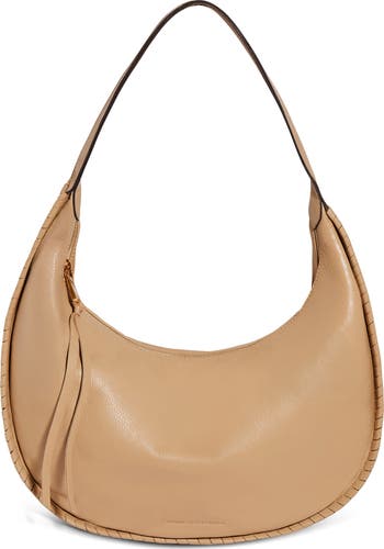 Decorative whipstitching trims the richly grained leather exterior of a crescent-shaped hobo bag designed with a slightly unstructured profile and an array of pockets for easy organization.