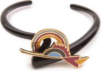 - Kandinsky Violett–inspired jet, red, and blue hand-enameled charm placed on a jet enamel bangle