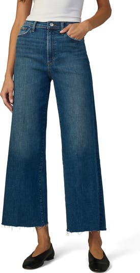 Raw hems relax the polished style of these stretchy, retro-chic jeans made with a high waist and ankle-length wide legs.