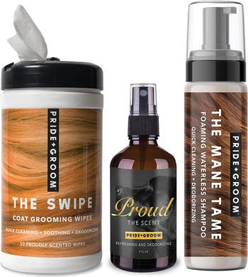 THE MID GROOM BUNDLE arms you with everything needed to get your pup from bath to bath in fresh form. Swipe goopy faces, freshen up a coat, and spritz away the day with these favorites from PRIDE+GROOM's beyond the bath collection. THE MID GROOM includes THE SWIPE wipes, THE MANE TAME waterless shampoo and PROUD, our signature scent. VALUE: $66