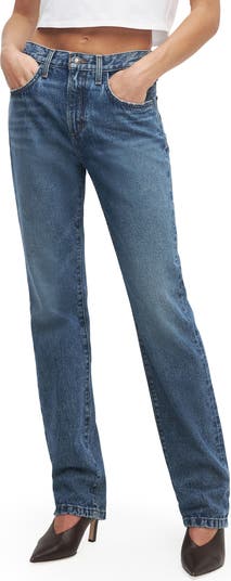 Vintage-vibe straight-leg jeans are a casual classic with their low-rise waist, full-length legs and nonstretch denim in a lived-in medium wash. The brand's logo is embroidered at the back waist for signature style.