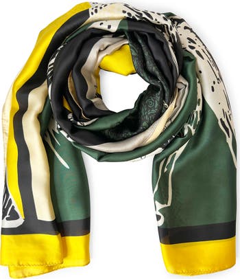The Mondrian – Green by Youzey is a lightweight faux silk scarf featuring an abstract design accented with subtle horse motifs. Rich green tones are balanced with cream, yellow, and black for a bold yet wearable look. Finished with a smooth, satin-like feel, this versatile women’s scarf can be styled around the neck, in the hair, or tied to a handbag for year-round wear.