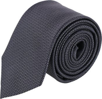 An interlocking jacquard design elevates the look of this slender silk tie.