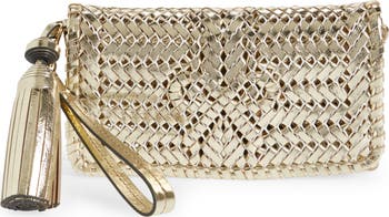 A signature bow is incorporated into the handwoven design of this metallic leather tassel-detailed clutch with a removable wrist strap.