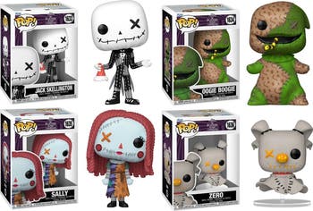 The Nightmare Before Christmas (Patchwork) Funko Pop! Set (4). Includes Jack, Oogie Boogie, Sally, and Zero. Each comes individually packaged in a Funko Pop window display box.