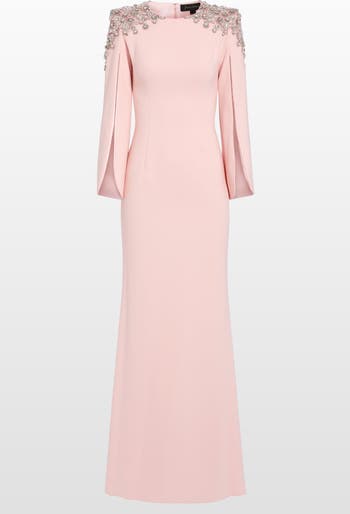 This striking long gown embodies sophistication and modern glamour. The long sleeves and structured padded shoulders create a bold yet refined silhouette, offering a sharp, elegant shape. Silver and crystal beading adorns the shoulders, adding a touch of opulence and sparkle to the design. The sleek, fitted bodice gently flows into a graceful floor-length skirt. Perfect for formal events, evening soires, or red carpet occasions.