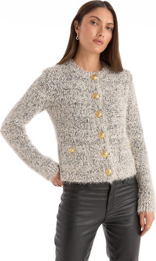 Timeless, elegant and chic - the Joana Knit Cardigan Top is the perfect crew-neck cardigan. Designed with a fluffy sparkle knit that's structured yet ultra soft, this style features padded shoulders and luxe gold Noli embossed dome buttons.