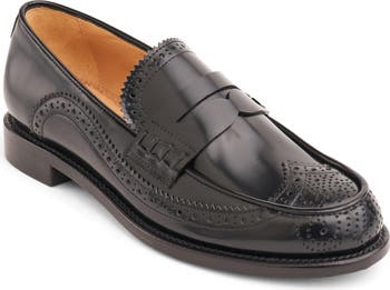 Wingtip styling elevates the look of a classic penny loafer shaped from burnished Italian leather.