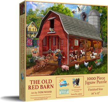 Experience the charm of rural Americana with "The Old Red Barn" 1000 piece jigsaw puzzle by SunsOut. This enchanting puzzle captures the essence of farmland life through the brilliant artwork of Tom Wood. With a completed size of 20" x 27", this masterpiece transports you to the countryside, right from your living room. SunsOut's superior craftsmanship is evident in every piece, ensuring a seamless assembly using interlocking pieces, crafted from high-quality recycled cardboard. The brand's commitment to sustainability is showcased through their use of soy-based inks and recycled board, making this an eco-friendly product, proudly made in the USA. The vivid and fully licensed artwork by Tom Wood is meticulously reproduced on large, full-color display boxes, making every piece you place a step closer to completing the mesmerizing farm scene. As a reliable and customer-centric woman-owned small business, SunsOut delivers a worry-free guarantee, promptly addressing any issues with missing or damaged pieces to ensure customer satisfaction. This puzzle offers more than just a pastime; it's an invitation to unwind, relax, and immerse in artful discovery, all while celebrating the rustic beauty of Americana. Perfect as a gift, this puzzle is sure to delight any puzzle enthusiast.