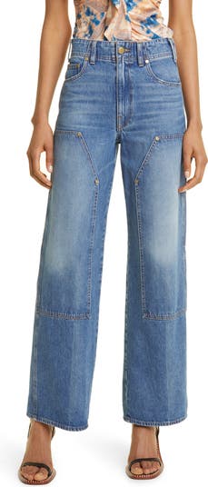 Reinforced knees lend a utility-inspired aesthetic to wide-leg jeans fashioned from faded denim.