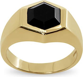 A bezel-set hexagonal black onyx emboldens this polished band ring crafted from sterling silver and plated in warm 18-karat yellow gold.