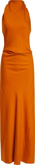 This sultry crepe gown is defined by its high cowled halter neck, bespoke hardware and a dramatic plunging back with a shaping twist. It has a second-skin fit with a flowy back gore that trails lightly behind as you move.