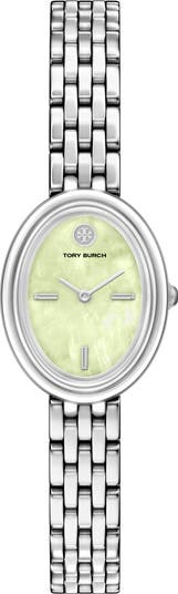 A minimalist mother-of-pearl dial with slim stick indexes distinguishes a beautiful oval timepiece set on a polished five-link bracelet .