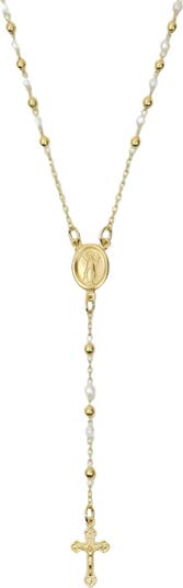 Light up your look with meaningful shine when you wear this rosary-inspired necklace that's adorned a polished medallion and glowing faux pearls.