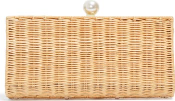Complete your destination style with this sleek clutch handwoven from natural rattan in a compact silhouette that's still large enough for your essentials. A pearly bead bauble tops the style with seaside al fresco elegance.