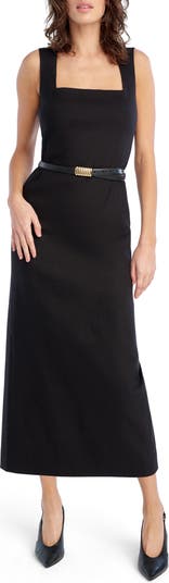 A timeless linen-blend midi dress is offered in a fitted silhouette for a look that works for summery desk days and drinks dates on warm evenings.
