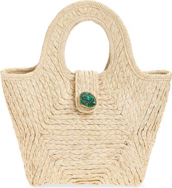 Sun-seeking texture takes shape in this woven raffia should bag designed with a sculptural top handle and finished with an interior wall pocket for easy organization.