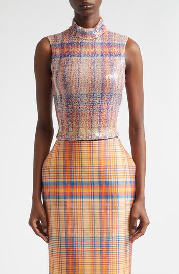 Maxwell set a celebratory mood for his tenth-anniversary runway collection, where he debuted this cropped mock-neck top that pairs preppy plaid and sparkling sequins to absolutely dazzling effect.