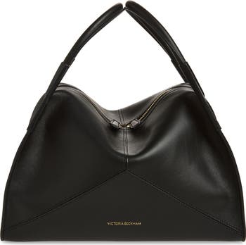 This supple leather top-handle bag is constructed with geometric panels to achieve a structured silhouette, while the top handles originate from the sides instead of the front for an unexpected design twist.