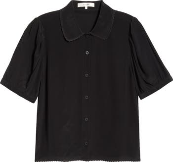 Darling puff sleeves frame this sweet scallop-trimmed shirt elevated in rich silk for a luxe look and feel.