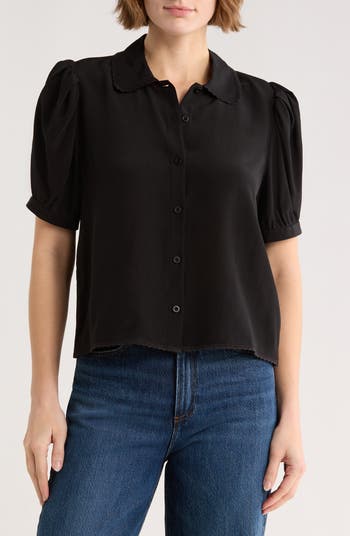 Darling puff sleeves frame this sweet scallop-trimmed shirt elevated in rich silk for a luxe look and feel.