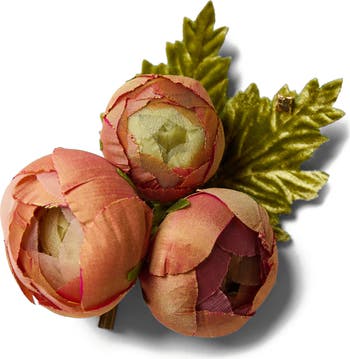 This refined blossom, which fittingly connotes charm and attraction, was first introduced to Europe during the reign of Elizabeth I in the 16th century. Embellished with silk velvet leaves, three cheery ranunculus blooms, composed of pastel pink, yellow and orange silk shantung, silk habotai and silk chiffon petals, capture the delightful essence of this popular flower. The ranunculus is the birth flower of the month of January.