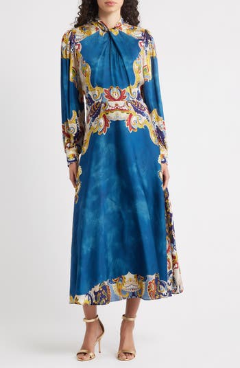 An ornate print adds opulence to this billow-sleeved maxi made with a twisted neckline and a drapey flared skirt to shape the silhouette.