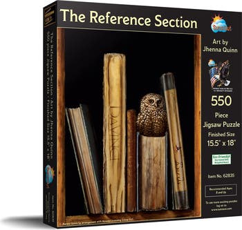 Immerse yourself in a world of imagination and problem-solving through The Reference Section 550 Piece Jigsaw Puzzle, a carefully crafted masterpiece featuring the alluring art of Jhenna Quinn. Measuring 15.5" x 18" upon completion, this stunning puzzle not only provides a rewarding experience with its perfectly interlocking pieces but also doubles as an exquisite art centerpiece. Constructed with high-quality recycled cardboard and imprinted with eco-friendly soy-based inks, SunsOut Puzzles exemplify superior durability, precision, and commitment to sustainability. The purchase of this puzzle, made entirely from recycled materials and presented in vibrant, full-color display boxes, supports a healthier environment, a woman-owned small business, and advocates for both aesthetic and ethical consumption. Whether you're an adult puzzle enthusiast or a beginner propelled by curiosity, the radiant owl, antique books, and the overarching challenge offered by this 550-piece jigsaw puzzle will captivate you. Engage your creativity and problem-solving skills for hours, and with every connection made, you edge closer to your artistic culmination - a serene retreat from the norm. Revel in the satisfaction of piecing together Quinn's stunning art and enjoy moments full of joy, challenges, and a sense of achievement.