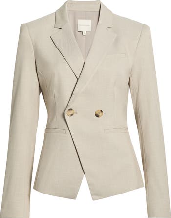 This double-breasted gabardine blazer is tailored with a nipped-in waist accentuated by the sharp cutaway front. The strong shoulders and wide notched lapels give it a bold, modern look.